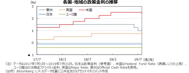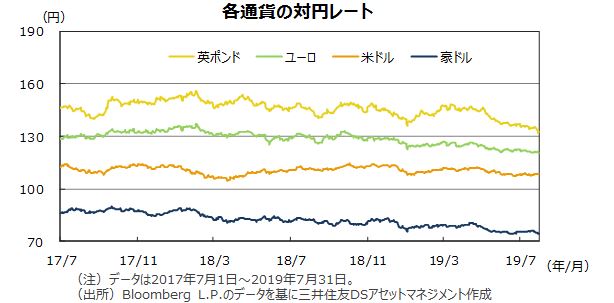円は対米ドルで下落しました。7月のFOMCでの大幅な利下げ観測が後退したことや米中協議の進展期待などから世界経済減速への警戒感がやや弱まり、円が売られました。一方、円は対ユーロ、豪ドル、英ポンドで上昇しました。ユーロ圏では低調な経済指標を受けてECBによる利下げ期待が高まりました。英国では、与党・保守党の新党首にボリス・ジョンソン氏が就任し、欧州連合(EU)からの合意なき離脱(Brexit)への警戒感が高まりました。また、豪州では豪州準備銀行(RBA)のロウ総裁が金利は長期にわたり低水準で維持されるとの見通しを示したことなどから豪ドルが下落しました。