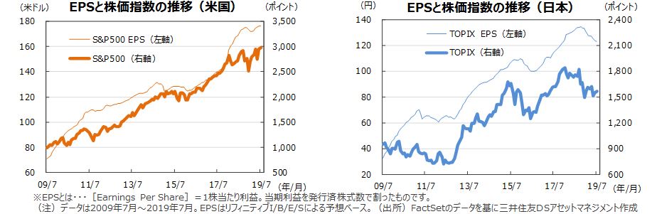S&P500種指数の7月の1株当たり予想利益(EPS)は176.18米ドル、前年同月比の伸び率は+2.9%でした。東証株価指数(TOPIX)の予想EPSは123.01円(同▲7.0%)で、6カ月連続のマイナスでした(いずれも予想はリフィニティブI/B/E/Sベース)。7月の米国株式市場は主要指標が史上最高値を更新しました。これは、6月末に米中首脳会談が実現し、米中の対立が軟化したことで市場心理が好転する中、月末に開催されるFOMCでの利下げに対する期待が強まったことが背景です。ただ、FOMC後のパウエルFRB議長の会見で追加利下げに対する期待が後退したことから、米国株式市場は調整色を強めました。S&P500種指数は前月比で+1.3%、ナスダック総合指数は同+2.1%、NYダウは同+1.0%上昇しました。一方、日本株式市場も米中交渉の進展や米国の利下げに対する期待から上昇しました。ただ、始まった4-6月期企業業績発表がやや低調で、業績の底入れが後ずれする可能性が強まったことなどから、上昇幅が限られました。TOPIXは前月比+0.9%、日経平均株価は同+1.2%でした。