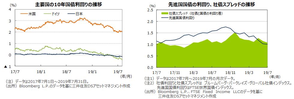 米国の長期金利は、予想を上回る米経済統計等を受けて利回りが上昇しましたがFRBによる利下げ観測等から月末にかけて低下傾向で推移し、ほぼ横ばいでした。 欧州の長期金利は、ユーロ圏の低調な経済指標や欧州中央銀行(ECB)理事会での利下げ期待を背景にドイツの10年国債利回りは低下しました。 日本の長期金利は、ほぼ横ばいでした。米国債の動向を睨みつつ利回りはマイナス圏で推移しました。 米国社債については、利回りを求める資金が流入し、国債との利回り格差が縮小しました。 |
