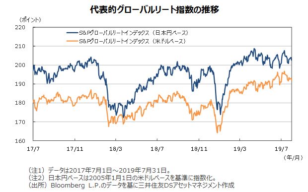 FRBが7月末の利下げに続き9月にも追加利下げをすると見られることや、ECBが9月に利下げや量的緩和再開のアナウンスを行うと見込まれることなどから、低金利環境が当面継続すると予想され、リートにとって好材料となりそうです。一方で、中期的に見れば米国の不動産市況はピーク圏にあり、その市況の下支えとなる経済成長はペース鈍化の流れにあることは重石となりそうです。ただし、リートの安定的な賃貸収入や相対的に高い利回りは着目されやすい展開が続くと見られ、リートが選好されやすい状況が続くと考えられます。