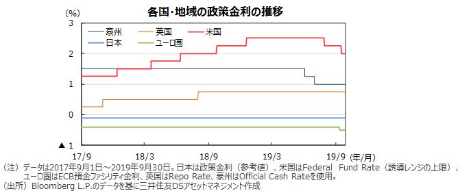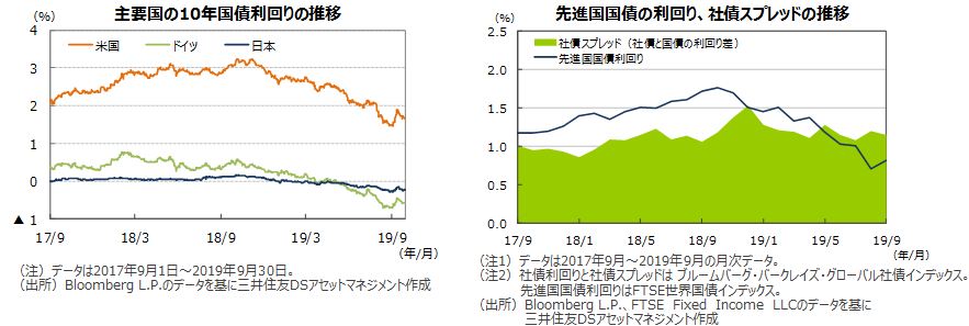 米国では、米中貿易交渉の進展期待が高まったことなどから10年国債利回りが上昇しました。一方、9月のFOMCで追加利下げが行われたことや、トランプ大統領の弾劾問題で米政治が混乱するとの警戒感が高まったことなどから、中旬から月末にかけては低下基調となり、上げ幅を縮小しました。