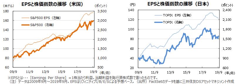 S&P500種指数の9月の1株当たり予想利益(EPS)は177.14米ドル、前年同月比の伸び率は+1.9%で、5カ月連続で最高益を更新しました。一方、東証株価指数(TOPIX)の予想EPSは122.18円(同▲8.6%)で、8カ月連続のマイナスでした(いずれも予想はリフィニティブI/B/E/Sベース)。9月の米国株式市場は、月初、米中双方の追加関税発動が警戒されましたが、5日に米中貿易協議の再開が報道されると上昇に転じ、中旬にかけて堅調に推移しました。その後は18日のFOMCで利下げが実施されたことで材料が出尽くし、また、トランプ大統領への弾劾調査などが重石となりました。S&P500種指数は前月比で+1.7%、NYダウが同+1.9%、ナスダック総合指数が同+0.5%、でした。一方、日本株式市場は、米長期期金利が上昇し、円が対米ドルで108円台を付けたこと等を背景に概ね堅調な推移となりました。TOPIXは前月比+5.0%、日経平均株価は+5.1%でした。