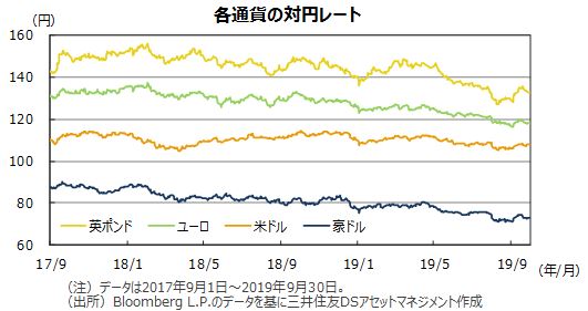 円は米ドル、ユーロ、豪ドルなどに対し下落しました。米中交渉が10月に再開する見通しとなったほか、トランプ大統領が10月1日に発動予定の対中追加関税引き上げを15日まで延期すると発表するなど、協議が進展するとの期待から安全資産とされる円が売られました。また、9月17-18日開催のFOMCで示された金利見通しが、想定よりもハト派でなかったと受け止められたことも円の下落要因となりました。英ポンドは、英国の合意なきEU離脱に対する懸念が和らいだことから、円に対し上昇しました。