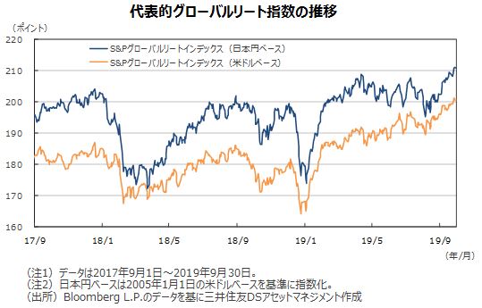 グローバルリート市場(米ドルベース)は、ECBが金融緩和再開を決定したことや、FRBが今年2回目となる利下げを実施するなど、欧米をはじめ世界的に金利が低下方向へシフトする中で、相対的に利回りの高いリートが選好される展開が続きました。また、米中貿易交渉の進展期待が強まったことからリスク選好度も高まり、前月比で+2.25%上昇しました。一方、円ベースの月間変化率では、ドル円レートが円安方向へ推移したため為替はプラスに寄与し、円ベースでは前月比+4.11%の上昇となりました。