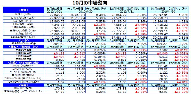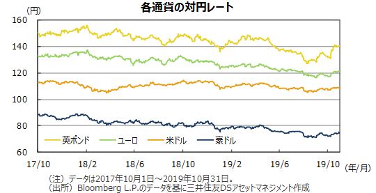 円はユーロ、豪ドル、ポンドなどに対し下落しました。米中貿易協議の進展期待が高まったほか、英国とEUの離脱協定案合意への期待が高まったことなどを受けて安全資産とされる円が売られました。一方、月末には米国の利下げを受けてやや円高が進行したため下落幅が縮小しました。一方、円は米ドルでほぼ横ばいでした。前述の米中協議の進展期待や英国のEU離脱に関する不透明感が和らいだことから月末にかけて円安・ドル高方向で推移しましたが、月末のFOMCで政策金利が引き下げられたことから円高・ドル安となり、月間ではほぼ横ばいとなりました。ポンドは、英国の合意なきEU離脱に対する懸念が和らいだことから、円に対し大幅に上昇しました。