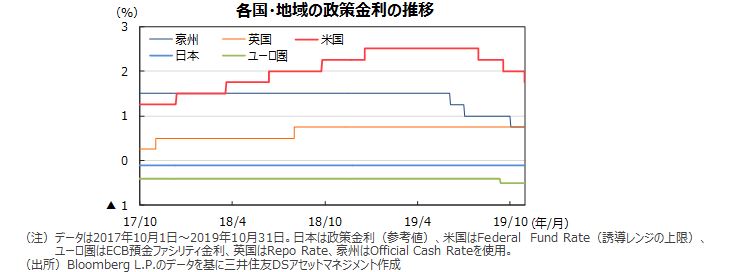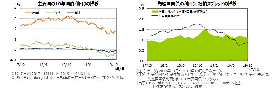 米国の長期金利は、米中交渉進展期待の高まりや、好調な米経済指標を受けて上昇しました。月末には、米連邦準備制度理事会(FRB)による利下げなどから上昇幅が縮小しました。 欧州の長期金利は、米中貿易交渉の進展期待や英国とEUの離脱協定案合意への期待などからドイツ、英国の10年債利回りは上昇しました。 日本の長期金利は、米長期金利に連動し上昇しましたが、日銀の金融政策会合を受けて上げ幅を縮小しました。米国社債の米国債との利回り格差は縮小しました。 |