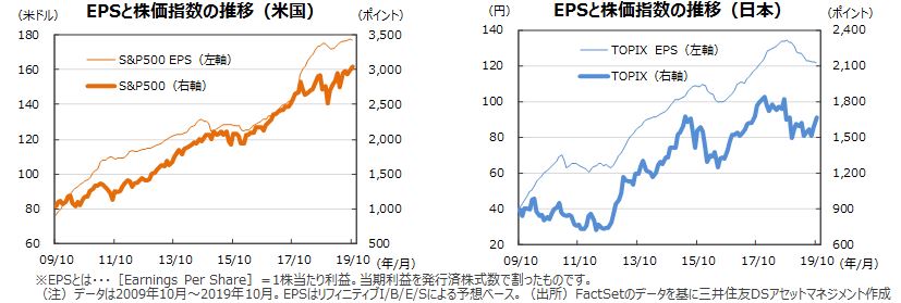 S&P500種指数の10月の1株当たり予想利益(EPS)は176.72米ドル(前年同月比の伸び率は+0.9%)で、前月の177.43米ドルを上回れず、過去最高益の更新は5カ月で止まりました。一方、東証株価指数(TOPIX)の予想EPSは121.82円(同▲9.3%)で、9カ月連続のマイナスでした(いずれも予想はリフィニティブI/B/E/Sベース)。10月の米国株式市場は、米国の軟調な景況指数や好調な雇用統計といったまだら模様な経済指標や、10~11日の米中協議への報道に一喜一憂する展開となりました。米中協議で部分合意との報道が伝わると、株式相場は堅調さを取り戻しました。30日のFOMCでは市場の予想通り25bpの利下げが決定したことも好感され、S&P500指数は史上最高値を更新しました。S&P500種指数は前月比で+2.0%、NYダウが同+0.5%、ナスダック総合指数が同+3.7%でした。一方、日本株式市場も、米中協議の部分合意を好感して上昇しました。月末にかけては米国の株高や企業業績への改善期待などから堅調な推移となりました。TOPIXは前月比+5.0%、日経平均株価は+5.4%でした。