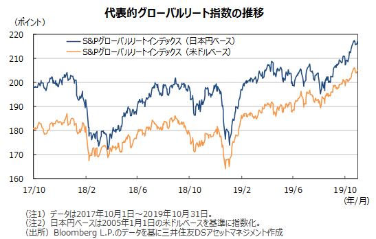 グローバルリート市場(米ドルベース)は、米国をはじめとして世界的に金融緩和が継続する中で、相対的に利回りの高いリートが選好される展開が続きました。また、米中貿易交渉の進展期待が強まったことや、英国とEUによる離脱協定案合意を受けてリスク選好度が高まったことから、前月比で+2.15%上昇しました。一方、円ベースの月間変化率では、同+2.18%の上昇となりました。ドル円レートは、月間でほぼ横ばいでした。