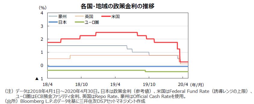 欧州中央銀行(ECB)は、3月の大規模な金融緩和(マイナス金利での長期資金の供給やQE拡大)に加え、4月には緊急理事会で資金供給オペの適格担保基準を緩和し、格下げに伴う投げ売りの抑制に動きました。4月の理事会ではこれらの金融政策を据え置きましたが、銀行への長期資金の貸し付け条件のさらなる緩和や、パンデミック緊急長期資金供給オペレーションを新たに導入しました。