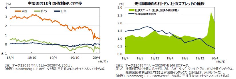 米国の10年国債利回りは低下しました。FRBの積極的な金融緩和策や景気低迷、原油価格の下落による金利低下圧力から利回りが低下しました。3月に大きく売られた社債は持ち直し、国債と社債の利回り格差は縮小しました。