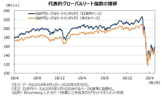 グローバルリート市場(米ドルベース)は、欧米での新型コロナ感染拡大がピークを迎えたとの見方が広がり、経済再開への期待が高まったことや、各国の積極的な経済対策や金融政策に支えられ上昇に転じ、前月末比7.55%上昇しました。また、円ベースの月間変化率では、新型コロナ収束や治療薬への期待などから米ドルが上昇する場面もありましたが、FRBの大規模金融緩和を背景に円が買われたことなどから、同6.52%の上昇となりました。