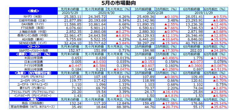 | 為替 | 経済再開の動きからリスク選好の流れとなり、円は米ドル、ユーロなど他通貨に対し下落しました。インドルピーは封鎖措置延長などが嫌気され下落しました。 |