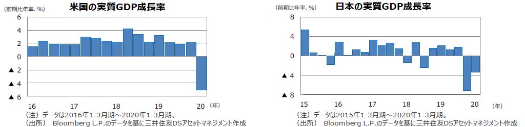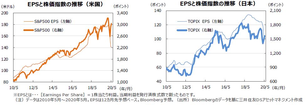 米国株式市場は、S&P500種指数の20年1-3月期の利益成長率は5月29日現在前年同期比▲12.6%です。続く4-6月期は▲42.8%の大幅減益となる見通しです。しかし、その後は7-9月期同▲25.0%、10-12月期同▲13.2%、21年1-3月期同+12.1%と、4-6月期を底に徐々に回復に向かう見通しです(以上、リフィニティブ5月29日発表)。日本は非常事態宣言が解除される中、徐々に経済活動が再開され始めました。日米株式市場は、新型コロナ感染第2波などの懸念は根強いものの、経済活動の復活に期待する展開が続く見通しです。