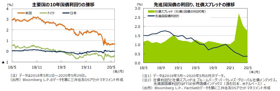 | 債券 | 主要先進国の国債利回りは、欧米を中心とした経済再開の動きを背景にやや上昇しました。新型コロナ感染拡大を受けて各国中央銀行が強力な資金供給を実施したことなどから、利回りの上昇は抑制されたものとなっています。一方、国債と社債の利回り格差は縮小しました。米連邦準備制度理事会(FRB)の社債ETFの購入開始などが背景です。 |