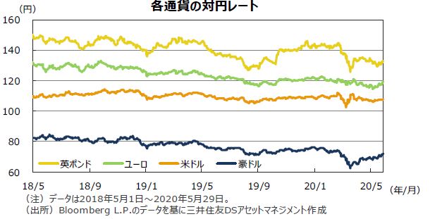 円は対ユーロでもやや下落しました。欧州での感染拡大がピークを越えユーロ圏各国が経済再開に動き出したことから、ユーロ圏経済が最悪期を脱したとの見方が広がりユーロは回復に向かいました。欧州委員会が提示した復興基金の設立も好感されました。