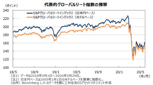 グローバルリート市場(米ドルベース)は、欧米など主要先進国で経済再開の動きが始まったことは好感されたものの、引き続き新型コロナの経済への影響が懸念されたことが重石となり、前月末比0.71%の上昇となりました。また、円ベースの月間変化率では、経済再開の動きやワクチン開発への期待などを背景とした米国株式市場の上昇などから米ドルが円に対し上昇し、同1.47%の上昇となりました。