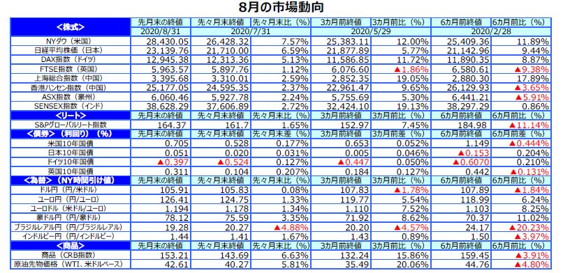 S&P500種指数の8月の1株当たり予想利益(EPS)は153.48で、前年同月比▲12.9%(前月同▲15.0%)となりました。ただ、予想EPSの水準は5月の141.06を底に3カ月連続で上昇しました。一方、東証株価指数(TOPIX)の8月の予想EPSは92.51、伸び率は同▲26.5%(前月同▲27.0%)で、前月(92.48)とほぼ同水準でした(以上、Bloomberg集計)。米国株式市場は5カ月連続で上昇しました。大手IT企業の好決算など市場予想を上回る決算を発表した企業が株価を牽引しました。トランプ大統領による追加景気対策にも期待が集まりました。米中対立の激化が懸念されましたが、S&P500種指数は史上最高値を更新しました。主要株価指数は、ナスダック総合指数が前月比+9.6%、S&P500種指数が同+7.0%、NYダウが同+7.6%でした。一方、日本株式市場も米株高や円高是正を背景に上昇しました。ただ、28日に安倍首相が辞任を表明したことが重荷となりました。TOPIXは前月比+8.2%、日経平均株価は同+6.6%でした。