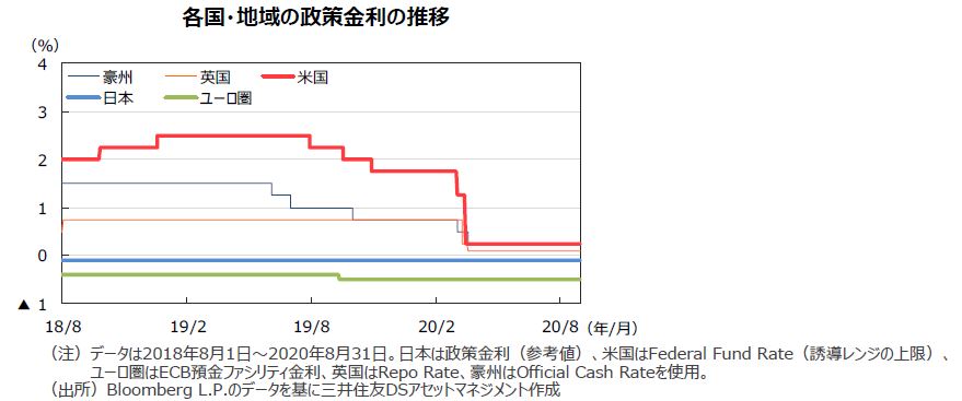 米連邦準備制度理事会(FRB)は新型コロナの感染再拡大を受け、大規模な金融緩和政策を行っており、当面の間ゼロ⾦利を据え置くとしています。8月の臨時の米連邦公開市場委員会(FOMC)では、FRBが一定期間の平均で2%を上回る物価上昇率を目指す『新たな指針』を発表しました。欧州中央銀行(ECB)も金融緩和策を維持しています。6月にはPEPP(パンデミック緊急購入プログラム)の拡大と延長を決定し、少なくとも2021年6月まで国債の購入を継続します。日銀は3月から5月にかけて資産買入れ強化や企業金融支援等の新型コロナ対策を矢継ぎ早に打ち出し、6月には企業等の資金繰り支援策を拡大しました。一方、金融政策は6月以降据え置いています。