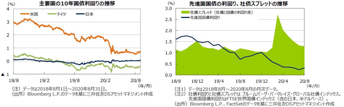 米国の10年国債利回りは前月末から上昇しました。新型コロナ感染拡大によって急減速した経済を支えるため、各国では大規模な財政政策が行われており、それを賄うために国債が増発されています。景気が緩やかながら回復基調となる中、8月初旬、米国の四半期定例入札予定では過去最大となる増発が発表され、需給悪化が懸念されたことから国債利回りが上昇しました。一方、国債と社債の利回り格差は縮小しました。緩やかな景気回復の流れが続き、金融市場が安定していることが一因となりました。ユーロ圏や日本も米国に追随して利回りが上昇しましたが、日本では感染再拡大もあり景気回復の強さが米欧に比べ弱かったため、小幅な上昇にとどまりました。