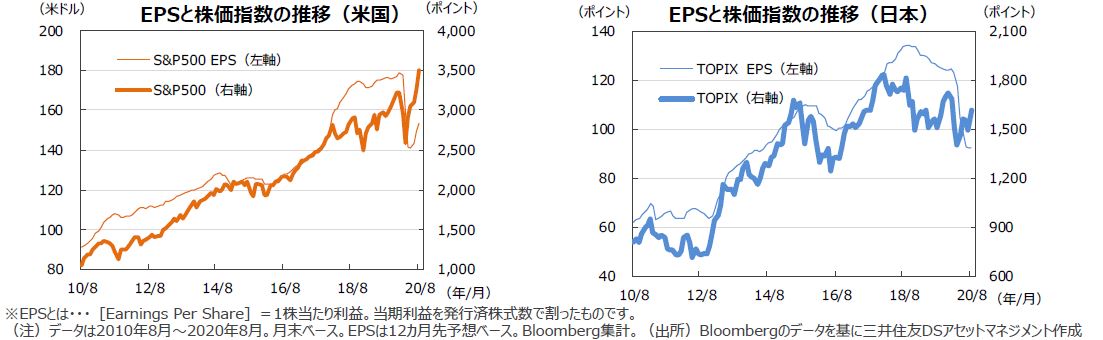米国は、S&P500種指数採用企業の4-6月期の利益成長率は▲30.8%ですが、7-9月期は同▲22.9%、10-12月期は同▲14.7%、21年1-3月期は同+11.8%、4-6月期同+43.4%と、20年4-6月期を底に回復に向かう見通しです(以上、リフィニティブ8月31日発表)。一方、日本のTOPIX採用企業の利益成長率は20年が前年比▲21.2%ですが、21年は同+34.5%、22年は同+12.9%と大幅な改善が予想されます(以上、Bloomberg集計。8月31日)。米国株式市場は、大規模な金融緩和の継続に加えハイテク分野への期待などが引き続き支えですが、今後は大統領選挙が大きな変動要因です。一方、日本株式市場も、新政権の政策運営に注目が集まる展開となりそうです。