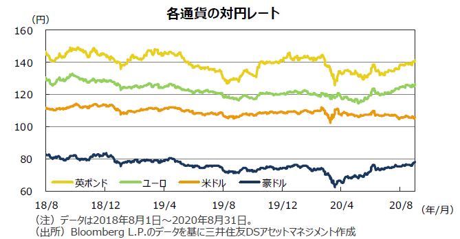 円は対米ドルで一時107円台まで下落しましたが、月を通じてはほぼ横ばい、他通貨に対しては総じて下落しました。米ドル安に一服感がみられる一方、リスク選好の動きは続き、新型コロナ感染拡大が続くブラジルを除き、新興国の通貨や資源国通貨が上昇しました。また、欧州の堅調な経済指標を背景にユーロも上昇しました。円は対ユーロで下落しました。欧州でも一部では新型コロナの感染再拡大がみられましたが、7月に欧州連合(EU)で合意された7,500億ユーロの復興基金や各国の追加財政政策などから、景気の回復傾向は維持されるとの見方が広がりユーロは上昇しました。円は対豪ドルで下落しました。豪ドルは世界的な株価の上昇を受けたリスク選好の動きや商品価格の上昇を背景に上昇しました。