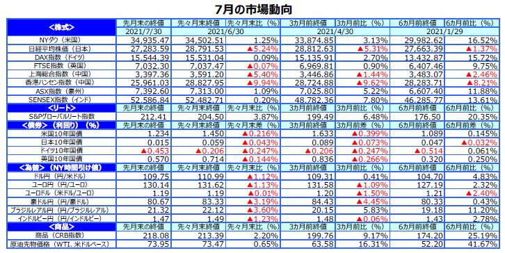 7月の主要国の株式市場は、高安まちまちとなりました。米国では、米連邦準備制度理事会(FRB)による量的緩和の早期縮小観測が後退したことや、好調な4-6月期決算を受けて、NYダウなどの主要株価指数が過去最高値を更新するなど、しっかりとした展開となりました。欧州では、新型コロナの変異ウイルスの感染拡大による世界景気悪化懸念から上値が重くなったものの、底堅い動きとなりました。一方、日本では、変異ウイルスの感染急増が嫌気され、日経平均株価が続落しました。また、中国では、政府の企業への規制強化を受けて、上海総合指数や香港ハンセン指数が大幅に下落しました。 |