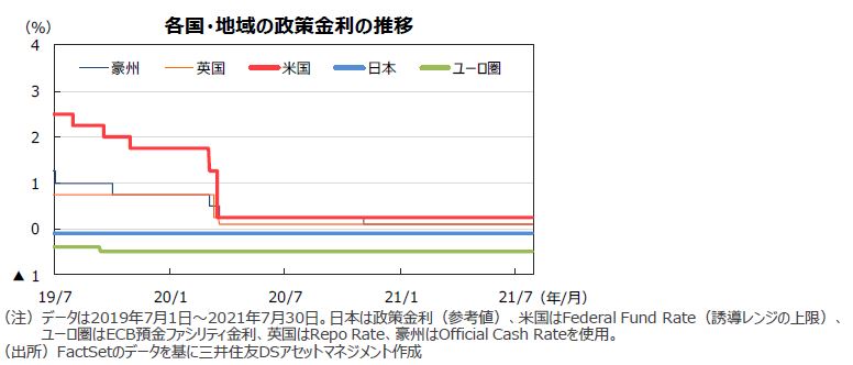 米国は、新型コロナの変異ウイルスによって感染拡大が続いているものの、雇用情勢に改善がみられることに加え、ワクチンの普及によりサービス消費が加速するなど、景気は上向き続けていると考えられます。今後は、量的緩和縮小の開始時期がいつになるのかが注目されます。