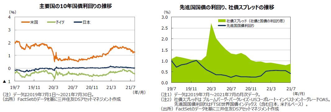 主要先進国の10年国債利回り(長期金利)は低下しました。米国では、パウエルFRB議長の議会証言を受けて、量的緩和の早期縮小観測が後退したことや、世界で変異ウイルスの感染拡大が収まらず、景気回復が遅れかねないとの懸念などから、6月末の1.4%台半ばから1.2%台前半に低下しました。欧州では、ECBがフォワードガイダンスを修正し、超低金利政策をより長く続けることを示したことから、長期金利が大きく低下しました。日本でも、金融政策決定会合で大規模緩和が維持されるなか、長期金利は低下しました。社債については、投資家のリスク回避姿勢から国債と社債の利回り格差が拡大しました。