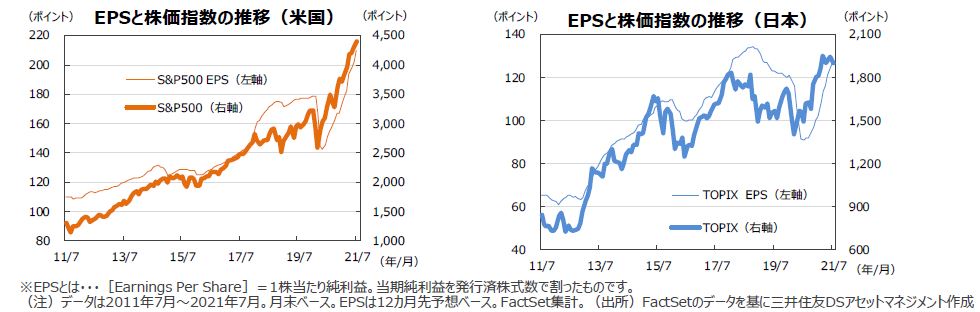 S&P500種指数の7月の1株当たり予想利益(EPS)は209.6で、前年同月比+38.8%(前月同+39.1%)と6カ月連続のプラスとなりました。予想EPSの水準は5カ月連続で過去最高を更新しました。一方、TOPIXの予想EPSは127.1で、伸び率は同+39.9%(前月同+36.8%)と大きく上昇しました。米国株式市場は、変異ウイルスの感染拡大が懸念されつつも、好調な企業業績と長期金利の低下基調が支えとなりました。米国株式市場はグロース株を中心に最高値を更新する展開となり、主要3指標は7月26日にそろって史上最高値を更新しました。月間ではS&P500種指数が前月比+2.3%、NYダウが同+1.3%、ナスダック総合指数が同+1.2%でした。一方、日本株式市場は、過去最大の感染者数の増加から景気回復への懸念が再度広がったこと、下旬から始まった4-6月の業績発表は総じて好調なものの、株価がそれを素直に反応しない、といったことなどから軟調な展開となりました。日経平均株価は前月比▲5.2%、TOPIXは同▲2.2%でした。