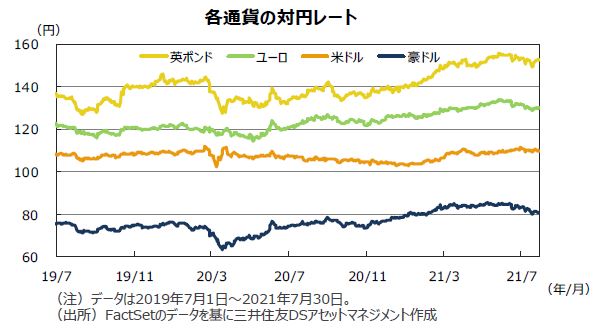 7月の円相場は欧米の金利低下やコロナ感染拡大によるリスク回避の動きを受けて、主要通貨に対して上昇しました。パウエルFRB議長が現状の物価上昇は一時的なものとして、早期のテーパリング開始に否定的な見解を示したため、米長期金利が低下して日米長期金利差が縮小したことなどから、円は対米ドルで109円台後半に上昇しました。同様に、ECBがフォワードガイダンスを変更したことに伴い、超低金利政策の長期化観測で欧州金利が低下したことなどから、円は対ユーロで130円台前半に上昇しました。また、円は、豪州の長期金利低下や資源価格上昇一服などを背景に、対豪ドルで80円台後半に上昇しました。