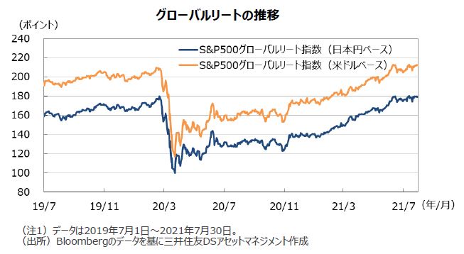 グローバルリート市場(米ドルベース)は上昇しました。上旬から中旬にかけては、新型コロナウイルスの感染抑制や、ワクチン接種の進展に伴う経済再開期待などから上昇しました。中旬には変異ウイルスの感染拡大を受けて弱含む局面があったものの、長期金利の低下が加速したことなどから持ち直し、下旬にかけて高値圏を維持しました。S&Pグローバルリート指数(米ドルベース)は前月末比+3.9%となりました。対ドルで円高となったことから円ベースでは同+2.7%となりました。