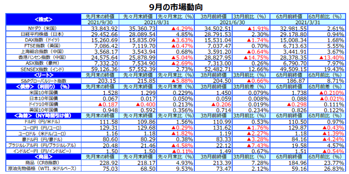 9月の主要国の株式市場は、高安まちまちとなりました。米国では、連邦公開市場委員会(FOMC)で年内の量的金融緩和の縮小(テーパリング)開始が示唆されたことや、中国の不動産大手のデフォルト懸念への警戒感が重しとなり、軟調な展開となりました。欧州では、米株市場の下落や中国経済の減速懸念を受けて、下落しました。一方、日本では、菅首相が自民党総裁選への不出馬を表明したことや新型コロナウイルスの感染者が急減したことを背景に大幅に上昇しました。中国では、中国の不動産大手のデフォルト懸念が意識されるなか、上海総合指数はほぼ横ばい、香港ハンセン指数は大きく下落しました。 |