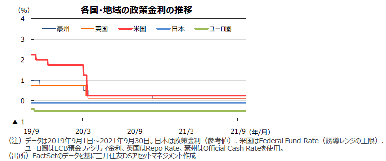 主要国の10年国債利回り(長期金利)は上昇しました。米国では、9月のFOMCにおいて、米連邦準備制度理事会(FRB)が早ければ11月会合でテーパリング開始を決定することを示唆し、ドットチャートの政策金利見通しもタカ派的な内容であったことから、長期金利が大きく上昇しました。欧州では、欧州中央銀行(ECB)が9月の理事会で債券購入ペースの縮小を決定したことや、ユーロ圏の消費者物価が上昇したことから、長期金利が大きく上昇しました。日本でも、欧米の長期金利上昇を受けて、長期金利が上昇しました。 |