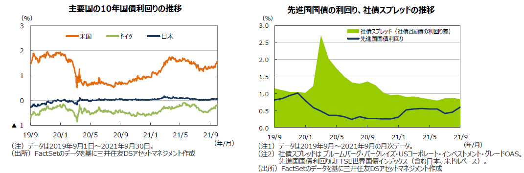 主要国の10年国債利回り(長期金利)は上昇しました。米国では、9月のFOMCにおいて、FRBが早ければ次回11月の会合でテーパリングの開始を決定することを示唆し、ドットチャートの政策金利見通しもタカ派的な内容であったことから、長期金利が大きく上昇しました。前月末に1.3%程度だった米長期金利は1.5%前半に上昇しました。欧州では、ECBが9月の理事会で債券購入ペースの縮小を決定したことや、ユーロ圏の消費者物価が上昇したことなどから、長期金利が大きく上昇しました。日本では、日銀が9月の金融政策決定会合で大規模な金融緩和政策を維持したものの、欧米の金利上昇を受けて、長期金利は上昇しました。投資適格社債については、国債と社債の利回り格差がやや縮小しました。