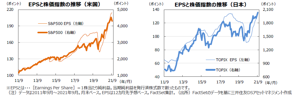 米国では、S&P500種指数採用企業の21年7-9月純利益は前年同期比+29.6%と予想されます(リフィニティブ集計。9月24日)。10-12月は同+21.9%と2桁増益ですが、22年は1-3月が同+6.1%、4-6月が同+3.8%と、伸び率は落ち着く見通しです。一方、日本の21年純利益の伸び率予想は前年比+54.9%と前月の同+52.3%より上方修正されました。続く22年は同+12.2%、23年は同+8.4%と増益基調が続く見通しです(FactSet調べ。9月30日)。今後は、米国の金融政策がタカ派的となったことから、雇用統計や物価動向を踏まえた長期金利の動きが引き続き注目を集めそうです。中国の電力供給の制約などを受け、世界経済の見通しが再構築される過程のなか、日米株式市場も不安定な動きとなる可能性があります。