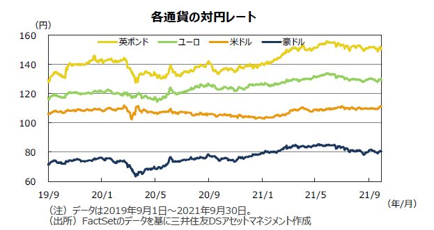 9月の円相場は対米ドルで下落しました。月前半は109円台~110円台でもみ合っていましたが、FOMCでFRBが早ければ次回11月の会合でテーパリング開始を決めると示唆したことなどから米長期金利が上昇して日米金利差が拡大し、月末にかけて円は対米ドルで111円台半ばに下落しました。一方、FRBが年内にテーパリングに踏み切るとの見方からユーロが対米ドルで下落したことに伴い、円は対ユーロでは小幅に上昇しました。円は、前月末の129円台後半から129円台前半に上昇しました。また、中国経済の減速懸念が嫌気されたものの、資源高の影響などが支えとなり、円は対豪ドルで80円台前半から80円台後半にやや下落しました。