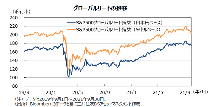 グローバルリート市場(米ドルベース)は下落しました。上旬は新型コロナウイルスのデルタ型の感染継続、中旬はFRBの金融緩和縮小への警戒感、下旬は中国不動産大手の経営問題を受けた不動産市場への波及懸念などから、リート市場は世界的に月を通じて下落基調となりました。S&Pグローバルリート指数(米ドルベース)は前月末比▲5.9%となりました。為替市場で円安となったことから円ベースでは同▲4.4%となりました。