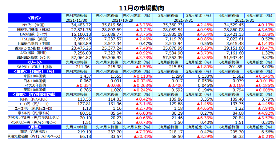 11月の主要国の株式市場は、月下旬に明らかになった新型コロナウイルスのオミクロン変異株(以下、オミクロン型)への警戒感から投資家のリスク回避の動きが強まったため、一部を除き下落しました。米国株式市場は月中旬まで、好調な7-9月期の企業決算やインフラ投資への期待などから堅調な展開となりましたが、オミクロン型の出現で市場心理が悪化し、月下旬に大きく下落しました。欧州の株式市場も、米国同様の動きとなり、月末にかけて下落しました。日本の株式市場も、景気回復が鈍化するとの懸念から月末にかけて急落しました。中国では、オミクロン型によるリスク回避の動きから香港株式市場が下落した一方、中国政府による景気対策への期待から中国本土株式市場は小幅に上昇しました。 |