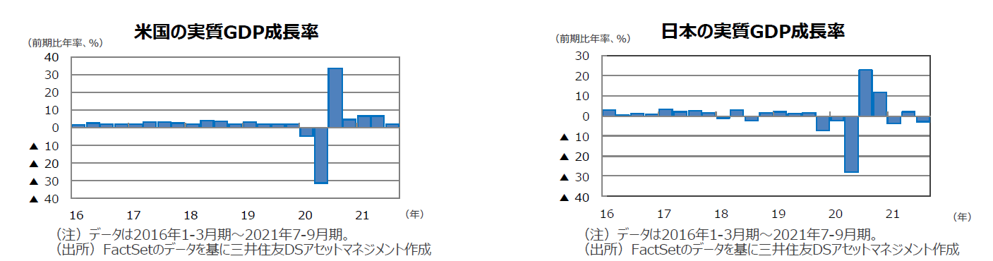 日本の2021年7-9月期の実質GDP成長率は前期比年率▲3.0%となりました。緊急事態宣言や供給制約に伴う生産減の影響を受けました。