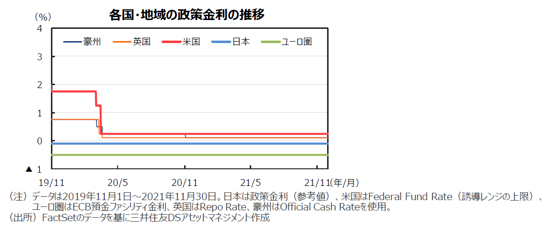 米連邦準備制度理事会(FRB)は11月2~3日の連邦公開市場委員会(FOMC)で、政策金利を据え置くと共に、量的金融緩和の縮小(テーパリング)の開始を決定しました。債券購入プログラムについて、11月より米国債で毎月100億ドル、住宅ローン担保証券で毎月50億ドルの買入れ縮小を決めました。また、パウエルFRB議長は、2022年の半ばにテーパリングを終了する意向を示しました。欧州中央銀行(ECB)は10月28日の理事会で、金融政策の現状維持を決めました。10月から縮小したパンデミック緊急購入プログラム(PEPP)の債券購入ペースも維持しました。日銀は10月27~28日に行われた金融政策決定会合で、大規模な金融緩和策を維持しました。