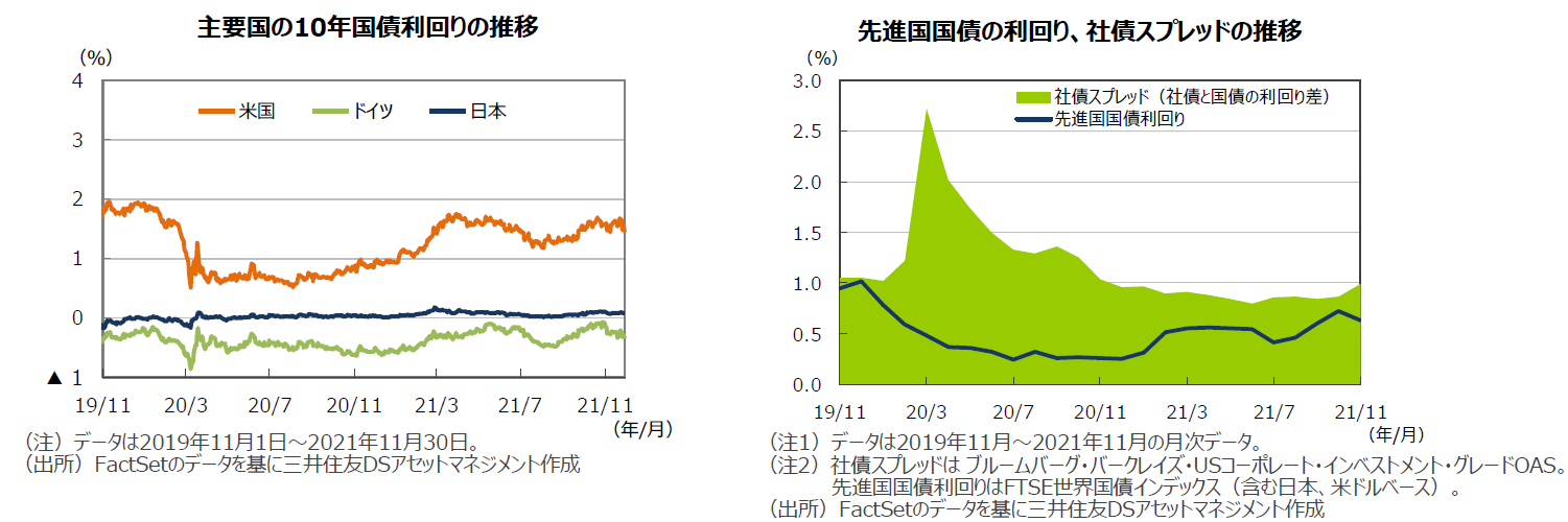 主要国の10年国債利回り(長期金利)はオミクロン型への警戒感から低下しました。米国の長期金利は、景気回復とインフレ懸念に伴う米利上げ観測の高まりから一時上昇しましたが、月末にかけて大幅に低下しました。ドイツの長期金利は、欧州での従来の新型コロナウイルスの感染再拡大に加えて、オミクロン型の感染が警戒され、大きく低下しました。日本でも、景気鈍化懸念から長期金利が低下しました。 |