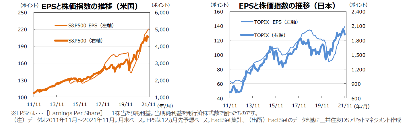 米国のS&P500種指数採用企業の21年7-9月純利益は前年同期比+42.4%です(リフィニティブ集計。11月26日)。続く10-12月も同+21.6%と2桁増益ですが、22年は1-3月が同+7.3%、4-6月が同+4.8%と、7-9月が同+7.0%と伸び率は落ち着く見通しです。一方、日本の7-9月純利益は前年同期比+49.4%です(QUICK集計、12月1日)。21年は前年比+54.3%、22年は同+13.6%、23年は同+7.8%と増益基調が続く見通しです(FactSet調べ。11月30日)。日米株式市場は、ファンダメンタルズはしっかりしていますが、オミクロン型の感染力や重症化リスク等に明確な情報が得られるまで、値動きの大きい展開が続きそうです。