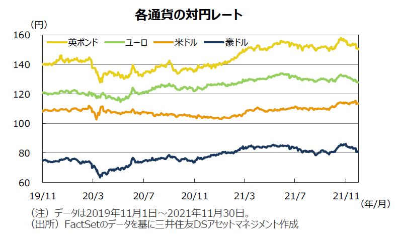円相場は、オミクロン型への警戒感から低リスク通貨とされる円が買われたことから、主要通貨に対し上昇しました。円は対米ドルで、米国のインフレ上昇による利上げ観測が高まったことに伴い、一時115円台半ばに下落しました。しかし、その後世界でオミクロン型への警戒が強まり、投資家のリスク回避姿勢が強まったことから、上昇に転じました。円は対米ドル113円台半ばで終了し、前月末比0.4%の円高となりました。一方、新型コロナウイルスの感染再拡大と早期利上げ観測の後退でユーロが対米ドルで下落したため、円は対ユーロでは前月末の132円近辺から127円台後半に上昇し、3.1%と円高となりました。また、円は対豪ドルで85円台半ばから80円台半ばに大幅に上昇し、前月末比6.0%の円高となりました。