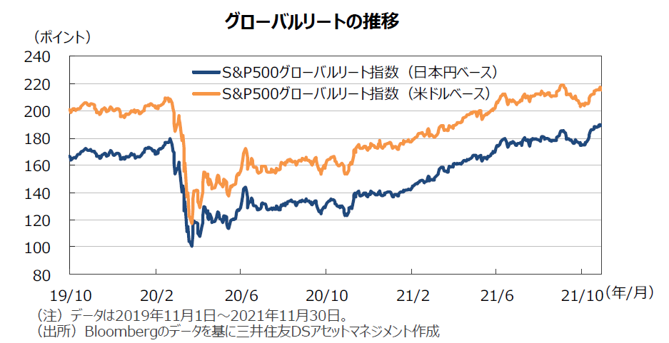 グローバルリート市場(米ドルベース)は下落しました。各国で発表されたリート各社の決算はおおむね堅調だったものの、インフレ高止まりの長期化による世界的な金融緩和縮小の前倒し懸念もあり、リート市場は月初から下旬にかけてもみ合いの動きが続きました。月末にかけては、新型コロナウイルスのオミクロン型への懸念が高まったことから世界的にリスク資産が売られ、リート市場も下落しました。S&Pグローバルリート指数(米ドルベース)は前月末比▲1.6%となりました。円ベースでは同▲2.0%となりました。