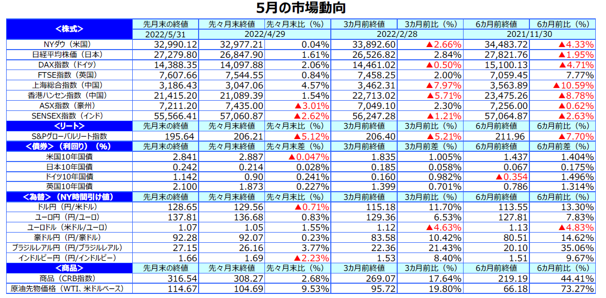 5月の主要国の株式市場はまちまちとなりました。米国株式市場は、インフレ抑制のため米連邦準備制度理事会(FRB)が金融引き締めを加速するとの見方から景気後退懸念が高まり、NYダウが8週続落するなど、月中旬まで下落基調を辿りました。しかし、月末にかけてインフレ加速への警戒感がやや和らいだことなどから急反発し、NYダウは前月比横ばいで引けました。欧州の株式市場も、欧州中央銀行(ECB)の利上げ観測が高まり、景気減速懸念が強まったものの、米国株式市場の反発を受けて持ち直しました。日本の株式市場は、上値の重い展開が続いていましたが、米国株式市場の反発を受けて小幅高となりました。中国株式市場では、上海のロックダウン解除の見通しを好感し、中国本土市場の上海総合指数、香港ハンセン指数ともに上昇しました。 |