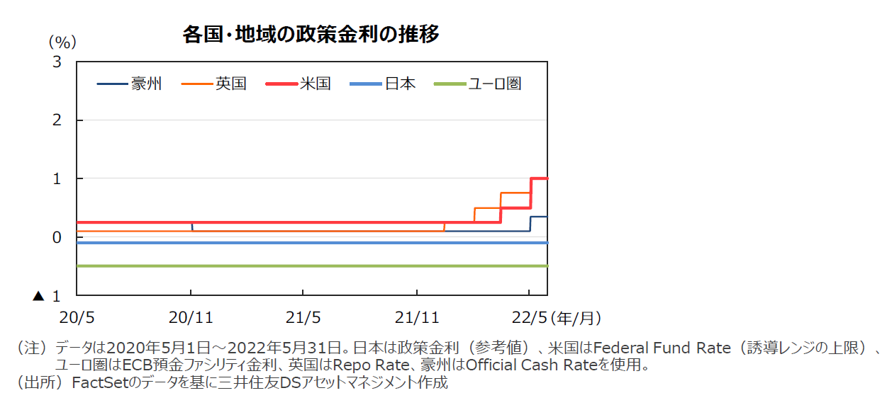 FRBは、5月の米連邦公開市場委員会(FOMC)でフェデラルファンド(FF)金利の誘導目標を0.25~0.5%から0.75~1.00%へ、0.5%引き上げました。また、保有資産を縮小する量的引き締め(QT)を6月から開始することを決めました。パウエル議長は記者会見で、6月、7月の会合でも0.5%の利上げを実施することを示唆しました。ECBは4月の理事会で、主要政策金利を据え置く一方、量的緩和政策の縮小(テーパリング)を続け、7~9月期に終える見通しを明らかにしました。日銀は4月の金融政策決定会合で、大規模な金融緩和策を維持し、10年物国債を無制限に買い入れる指し値オペを毎営業日実施することを決めました。