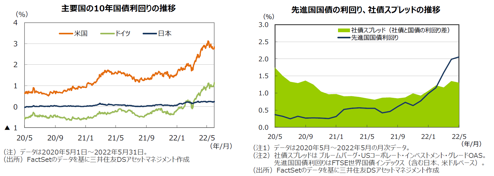 米国の10年国債利回り(長期金利)は、4月末の2.89%から小幅に低下し、5月末は2.84%で終了しました。4月の米雇用統計で非農業部門の雇用者数が市場予想以上に増え、労働市場の逼迫が続いていることを示したことから、FRBが速いペースで金融引き締めを続けるとの観測が強まり、米長期金利は一時3.13%と、2018年11月以来の高水準を付けました。しかし、その後は金融引き締めにより景気が後退に向かう懸念が高まり、株式市場が下落したことを受けて低下に転じ、もみ合いました。ドイツの長期金利は、ラガルドECB総裁が7月に利上げが可能になるとし、9月末までにマイナス金利を脱却できる考えも示唆したことから、大きく上昇しました。日本の長期金利は、日銀の連続指し値買いオペにより小幅の上昇にとどまりました。投資適格社債については、国債と社債の利回り格差が小幅に縮小しました。
