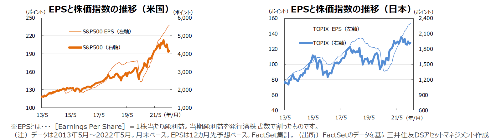 S&P500種指数の5月の1株当たり予想利益(EPS)は238.7で、前年同月比+20.3%(前月同+21.9%)と16カ月連続のプラスとなりました。 一方、TOPIXの予想EPSは153.3で、伸び率は同+27.3%(前月同+31.1%)でした。5月上旬の米国株式市場は、米10年国債利回りが3.1%台まで上昇するなか、軟調な展開となりました。その後、米10年国債利回りは低下に転じましたが、それが米景気の後退懸念の高まりにつながったことで主要3指数は揃って年初来安値を更新しました。下旬は27日に発表された4月の個人消費支出(PCE)価格指数の上昇が鈍り、インフレに安定の兆候が見られたことや企業業績に対する期待が高まったことなどから、主要3指標は大きく反騰しました。NYダウは前月比+0.04%、S&P500種指数は同+0.01%、ナスダック総合指数は同▲2.05%でした。一方、日本株式市場は、米国の金融引き締めと株価調整の影響を受けて、12日には2カ月ぶりに2万6,000円を割り込みました。その後は、米国株式市場が大幅に上昇したことを受け、日本株式市場も大きく反騰しました。日経平均株価は前月比+1.6%、TOPIXは同+0.7%となりました。