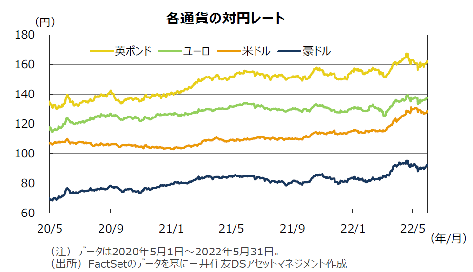5月の円相場は対米ドルで小幅に上昇しました。前月末に129円台だった円は、米雇用統計で雇用者数が市場予想以上に伸び、米長期金利が上昇したことから月上旬に130円台に下落しました。しかし、米金融引き締め加速観測を嫌気した米株式相場の大幅下落を受けて投資家のリスク回避姿勢が高まり、低リスク通貨とされる円の買いが優勢となり、反発しました。その後は127円台から129円でのもみ合いとなり、128円台半ばで終了しました。一方、円は対ユーロでは下落し、137円台で終了しました。ECBのラガルド総裁が7~9月の利上げを示唆したため、欧州金利が上昇し、ユーロ買いが優勢となったためです。また、円は資源国通貨とされる豪ドルに対しては92円台と、ほぼ横ばいでした。