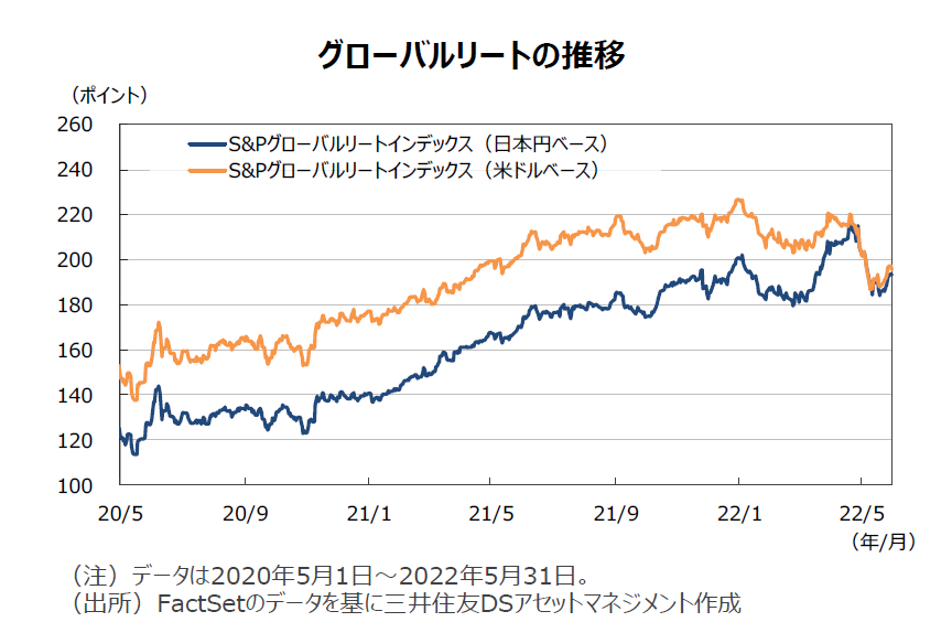 5月のグローバルリート市場(米ドルベース)は下落しました。FRBがインフレ抑制のため金融引き締めを加速するなか、米長期金利が高止まりしていることや、先行きの景気減速による物件の解約や賃料の下落懸念から米国リートは大きく下落しました。また、ECBの利上げ観測やウクライナ情勢を嫌気した投資家のリスク回避姿勢から、英国や欧州のリート市場も軟調でした。一方、日本のリートは訪日外国人受け入れ期待などから反発しました。S&Pグローバルリート指数(米ドルベース)のリターンは前月末比▲5.1%となりました。また、為替効果がマイナスに寄与し、円ベースは同▲5.8%となりました。